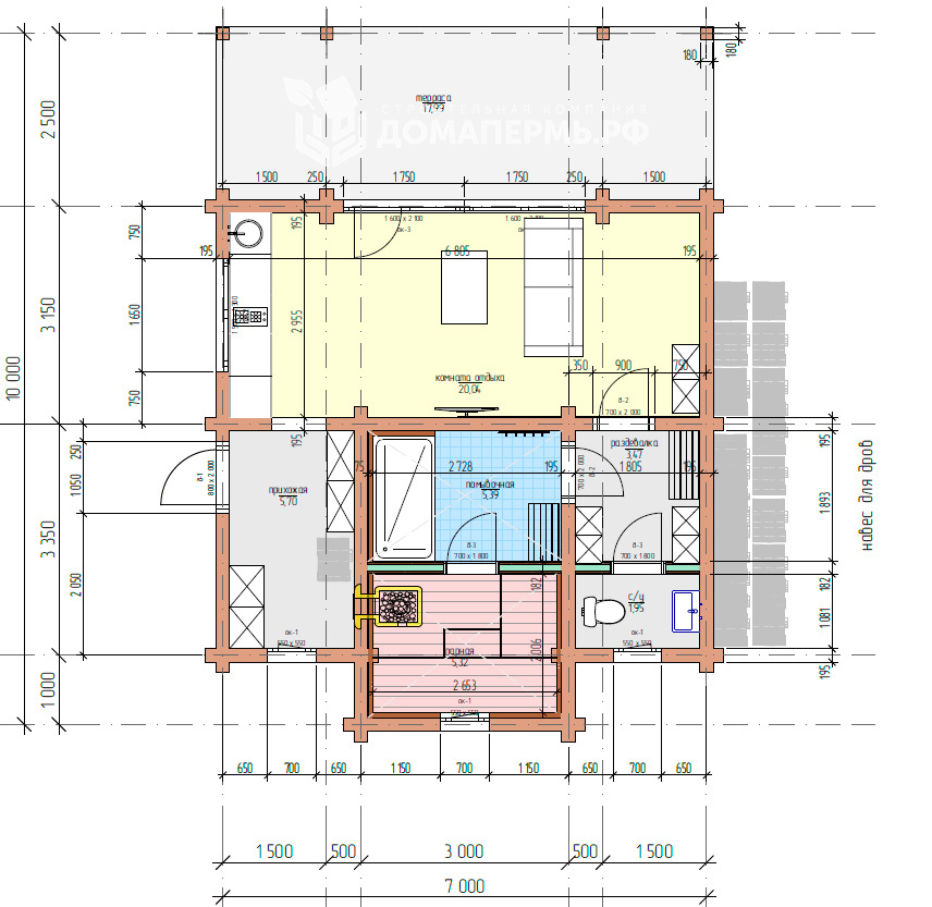 Планировка: Прихожая, санузел, комната отдыха, помывочная, парная, раздевалка и терраса.