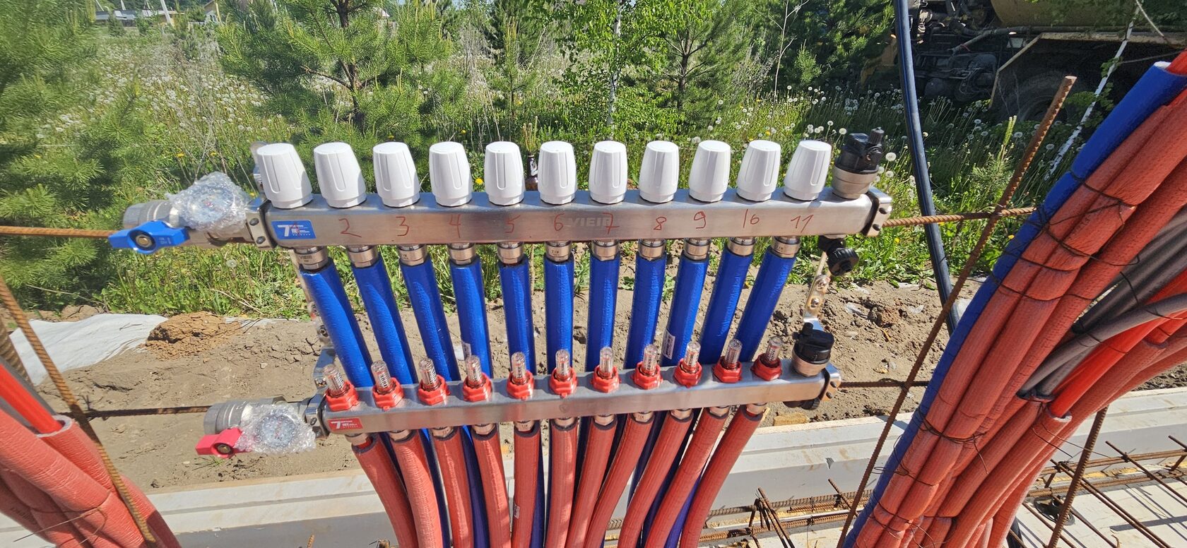 Инженерные системы: черновая разводка электричества (кабель в гофре, щиток, автоматы), разводка воды и канализации по дому, укладка теплого пола по всей жилой части дома, установка гребенки (без котла и бойлера)